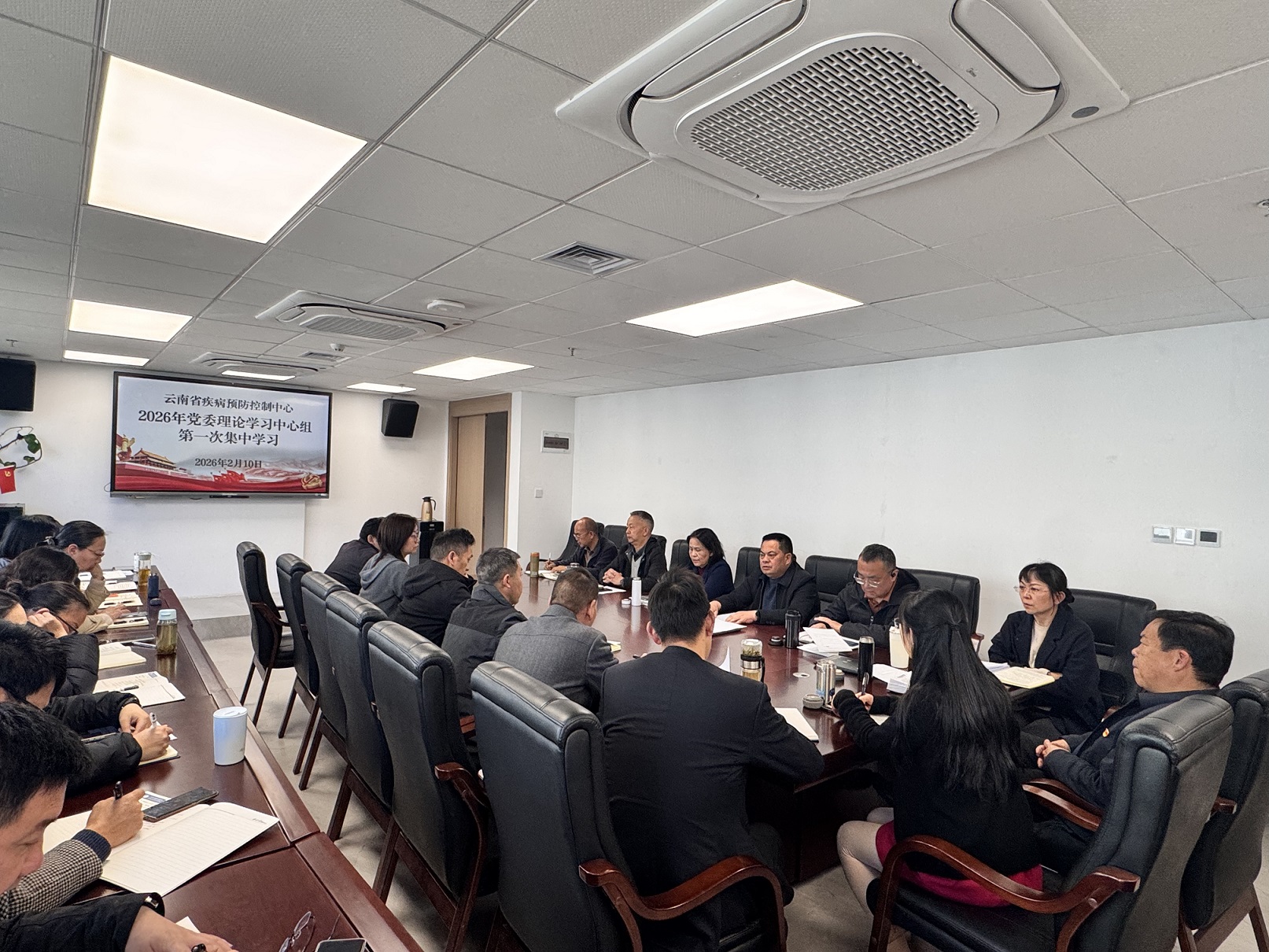 云南省疾病预防控制中心于2月10日举行2026年党委理论学习中心组第一次集中学习,深入学习领会习近平总书记在中央政治局民主生活会上的重要讲话精神、关于党的建设的重要思想、关于党的自我革命的重要思想以及关于加强党的纪律建设、作风建设的重要论述,为开好2026年度民主生活会筑牢思想基础。中心党委书记左仕富主持会议。