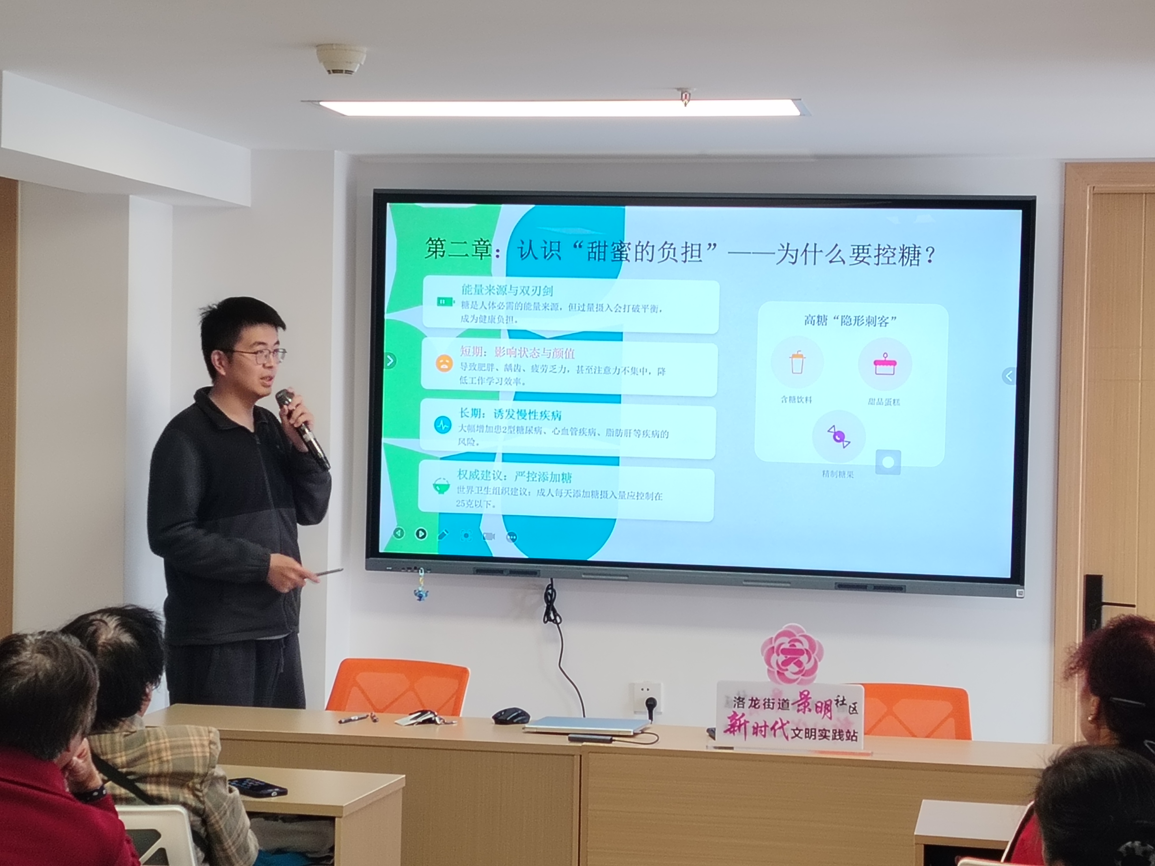 云南省疾控中心营养与食品卫生所的胡文敏以“老年人饮食建议”为主题展开讲解,她结合老年人身体特点和常见健康问题,用通俗易懂的语言详细讲解了膳食搭配原则、营养均衡要点及日常饮食中的常见误区,并针对高龄老年朋友提出了个性化的运动和饮食建议。慢性非传染性疾病防制所的胡顺宇围绕“健康生活,从控糖开始”主题进行授课,他从糖尿病的发病机制入手,系统讲解了血糖监测方法、并发症预防及健康生活方式干预措施,帮助居民正确认识糖尿病、科学防控糖尿病,他用贴近生活的案例,将专业知识转化为居民听得懂、记得住、用得上的健康常识。社区居民们纷纷表示,这样的活动既有知识含量,又接地气,真正把健康送到了心坎上。