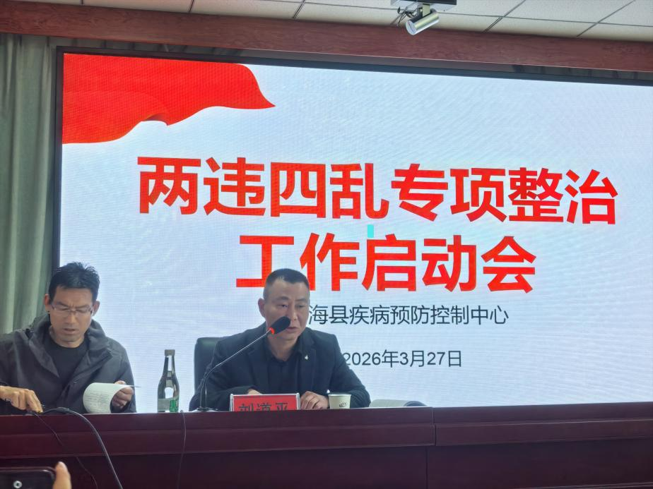 为深入贯彻习近平法治思想,规范卫生健康领域行政执法行为,优化营商环境,3月27日,通海县卫生健康局在疾控中心组织召开2026年集中纠治“两违四乱”工作启动会,对全系统违规异地执法、趋利性执法、乱收费、乱罚款、乱检查、乱查封专项整治工作进行全面安排部署,卫健局副局长刘道平、疾控中心主任普静波、卫健局政策法规与行政审批股符气荣及疾控中心全体人员参会。