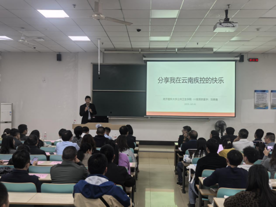 随后,省疾控中心苗研中心主任刘晓强博士,以同济医学院公共卫生学院在滇校友的身份分享交流。他不仅介绍了众多校友在云南省卫生系统的成长轨迹和发展现状,更结合自身从业经历讲述疾控工作中的成长故事,以鲜活案例解读疾控岗位的“职业乐趣”。同时,他鼓励同学们以昂扬斗志发掘平淡工作中的精彩,以能力提升应对行业挑战;坚持奋斗,保持自信敢于作为,将个人成长融入区域发展与疾控事业,为公共卫生事业贡献力量。
