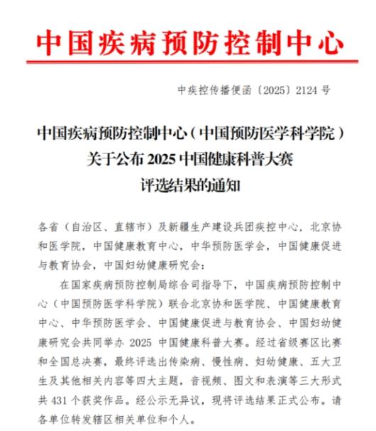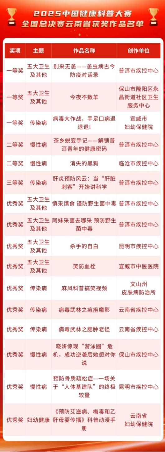 近日,在国家疾控局综合司指导下,中国疾控中心联合北京协和医学院、中国健康教育中心、中华预防医学会、中国健康促进与教育协会、中国妇幼健康研究会等共同举办的2025中国健康科普大赛全国总决赛圆满结束。大赛评选出涵盖传染病、慢性病、妇幼健康及五大卫生等四大主题,以及音视频、图文、表演等三大形式的431个获奖作品。其中,云南省参赛作品表现优异,有16部作品分获一、二、三等奖及优秀奖。