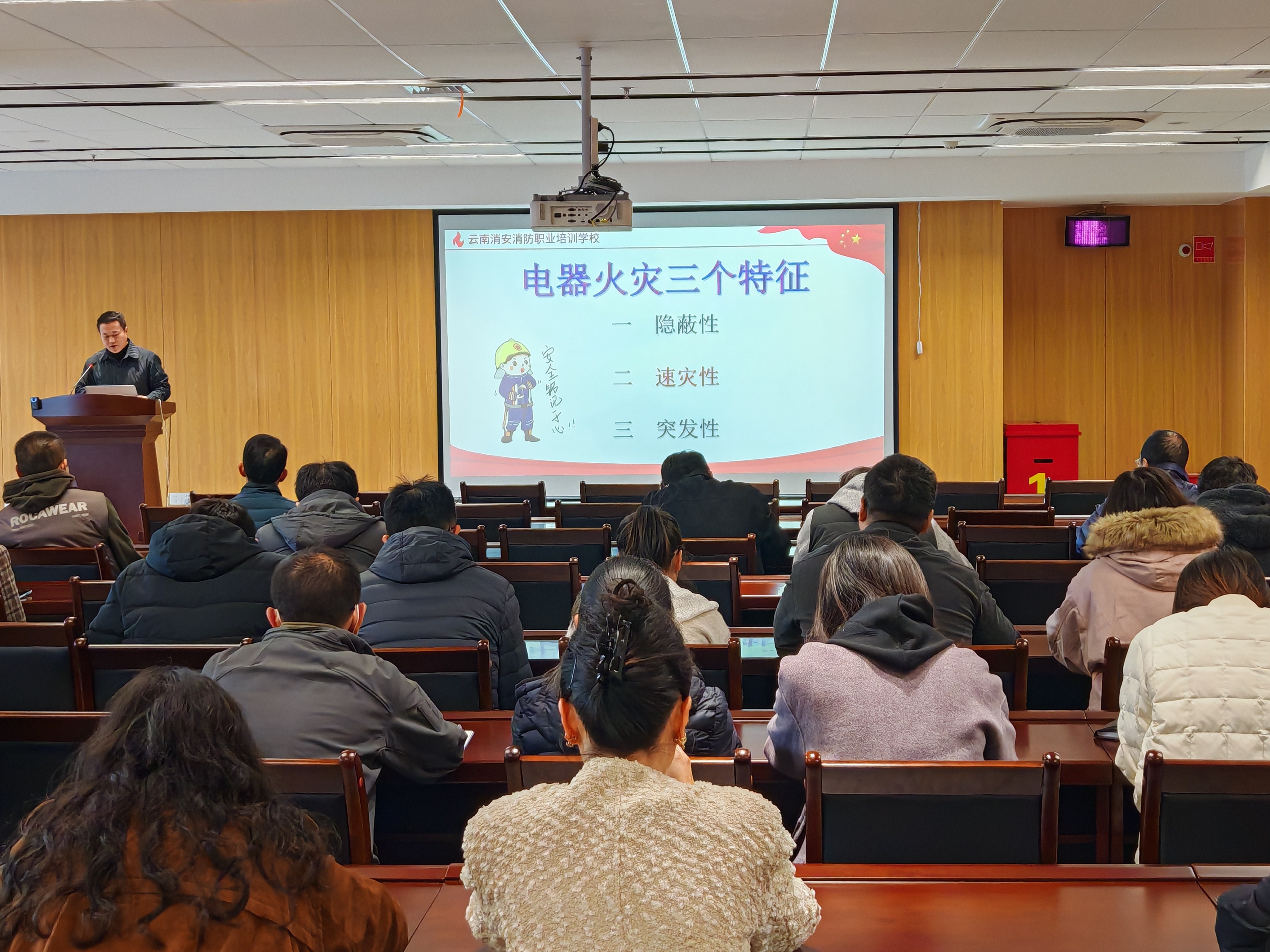 云南消安消防职业培训学校王析程老师开展消防知识培训并指导开展消防应急演练,培训中介绍了消防"四个能力"、消防器材使用、电气火灾、电动自行车违规充电、应急疏散逃生和车辆火灾的预防。