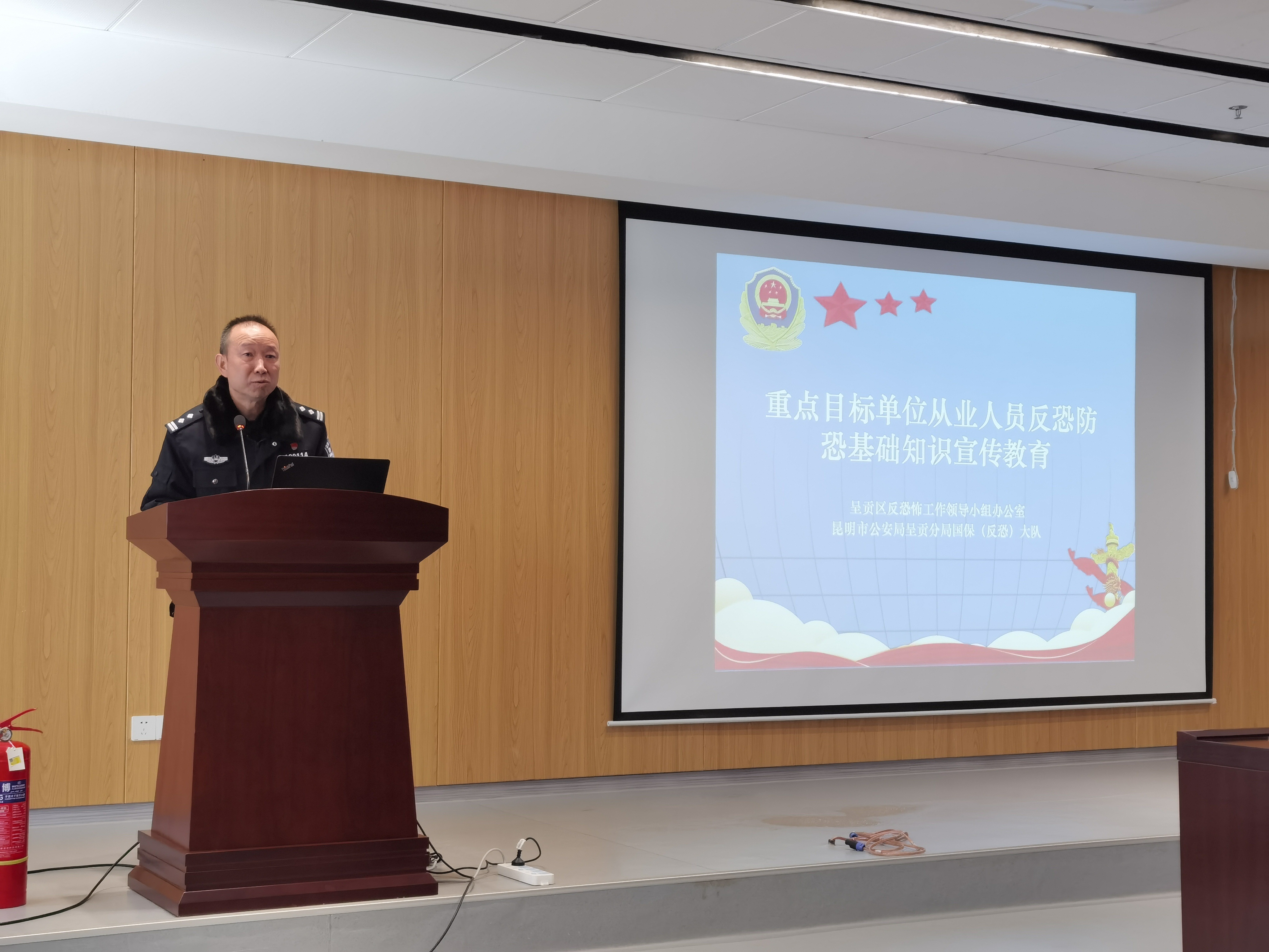 昆明市公安局呈贡分局反恐大队副大队长莫勉开展重点目标单位从业人员反恐防恐基础知识宣传教育培训,介绍了"安全"相关法律法规、预防恐怖活动基本知识、暴力恐怖和宗教极端行为危害、暴力恐怖典型案例。培训结束后,全体人员进行了消防应急演练。