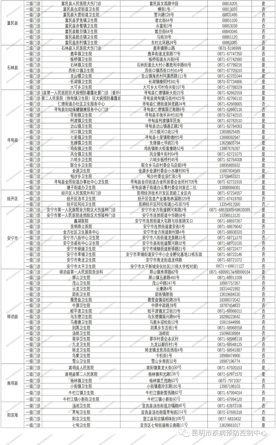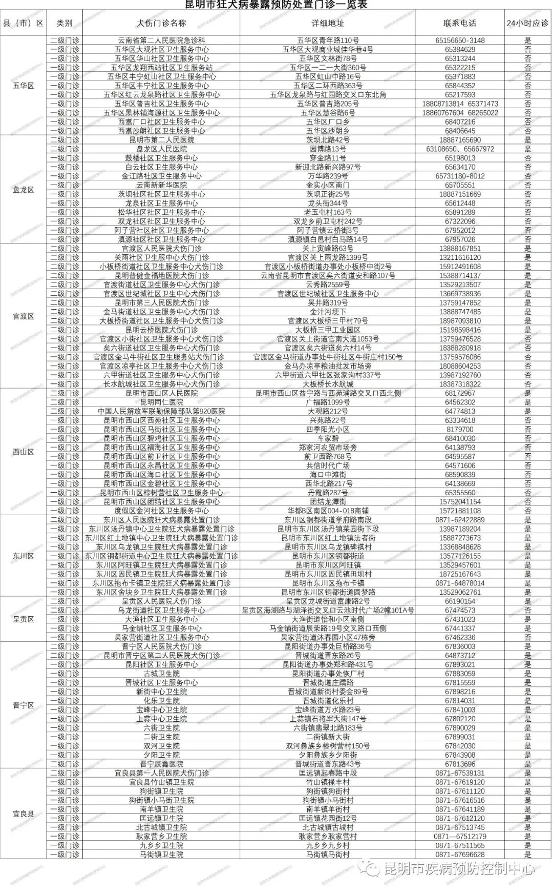 附件:昆明市犬伤暴露预防处置门诊信息(来源于昆明市疾病预防控制中心)